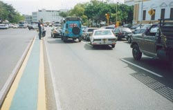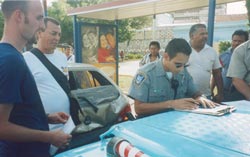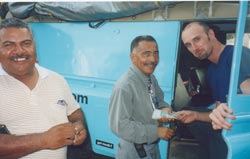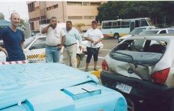 The taxi driver got on the phone to his brother who owned the car while the passengers just disappeared. A crowd soon gathered around and started asking us the usual questions about the trip. Passing motorists offered their witty remarks too. The sun was blazing hot and many a police car cruised by showing no interest at all. We deliberated for almost 3 hours, B went off with one of them to see how much Fiesta doors cost, T admired the occasional doris going into the nearby cultural centre. The door and bumper were going to cost about $800, never mind the rear wing and all the labour. We negotiated a payment of $700. A policeman eventually stopped and wrote a report so the owner of the car could claim on his insurance. The taxi driver was unlucky as he didn't have his licence on him and got a $60 fine for his troubles. T got away scot free except for the serious blow to his bank balance. The landy has a bit of a bend in the front bumper and some Ford paint on the A bar.