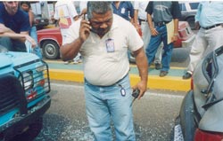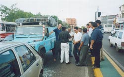 T was zooming along the dual carriageway skirting the lake at Maracaibo, looking out of the wrong window, when a red traffic light and stationary Ford Fiesta taxi appeared in front of the landy. B shouted a warning but it was too late and 12 metres of skidding on the greasy road surface were just enough to bring the landy to a halt embedded in the back door of the new Ford. On impact the rear window of the Fiesta shattered and flew all over the landy windscreen and bonnet which was a wicked sight. Fortunately nobody was hurt, they were just a little shocked.
