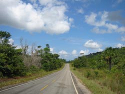 We had our passports stamped out of Brazil after only being in the country for one day. We 'forgot' to return to the nearby town to do the customs exit for the landy thinking that it would save time when we re-enter Brazil. We passed some big lorries which had arrived and were transferring their load to some ex British army Bedford 4x4 trucks on the Guyanese side and soon arrived at the ferry. We crossed the river beside the foundations of a half built bridge and drove into Guyana. There was a guy who sprayed our tyres with some pesticide and no other indication of any border controls whatsoever. We entered Lethem to fill up with diesel and headed north east on the smoothish dirt road towards Georgetown, some 500kms away.