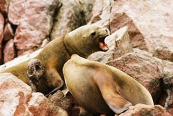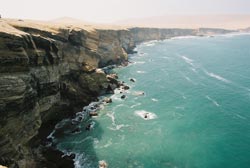 With B on his way to Iquitos, Tom and Magaly headed south to escape the clouds of Lima and find some sun. We first visited the coastal national park of Ica. I had been here before in 2001 but it had been foggy, this time the sun was out and we joined a boat trip around the rocky islands teeming with birds, seals and the odd penguin. The islands are still used by people who come and scrape up the guano (bird poo) which is one of the best fertilisers around. Afterwards we landied along the coastal desert until we arrived on top of cliffs overlooking the 'Cathedral', a natural rock arch carved by the waves with a tunnel through the cliffs beside it.