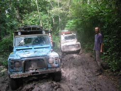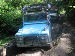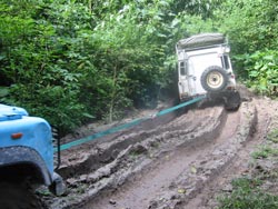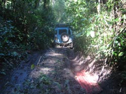 For very deep ruts we had two methods. Short stretches more than a few metres long could be hit with speed, letting momentum carry us over, sliding on the diff guards like a sledge. Longer ones needed to be straddled which meant that one of us had to drive very slowly in low first or second while the other acted as guide. Inevitably the landy would slip into the ruts, sometimes we could power out, mostly we had to use the sand ladders to enable us to drive back up onto the edge of the track again. Other times we had to winch or tow each other through. The sand ladders also came in useful for reducing the depth of the ruts and allowing essential clearance for the differential. The disadvantage of using the sand ladders was that they'd fill with the glue-like jungle mud and subsequently weigh about 40kgs each which made putting them back on the roof very difficult.