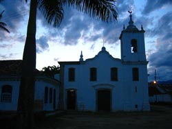 Paraty is the main colonial town on this part of the coast and a popular tourist spot. We found a good campsite near the beach. The sea is none too clean due to the nearby river putting out silt and the usual pollution and its very shallow, you can walk out for 300 metres or so. However, there's plenty of colonial architecture and some old churches, one of which is close to the shore and when the tide is particularly high, the sea reaches up to the door.