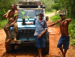 In the morning we were recommended to take a quick drive to the waterfalls in the small national park nearby. Almost there we met three guys who were 'repairing' the potholed dirt track and asking for tips. They placed a dug up fern in the way in a vain attempt to discourage landy drivers from just driving through at top speed. Their daftness earned them a couple of coins and a place on the web anyway.