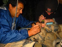 Nearing El Chalten the sunshine turned to rain and we arrived in the dreary village on a wet, windy and dark night. We found a campsite with hot showers and a small hut thing acting as a windbreak. Backing the landy as close as we could, the tent was still sticking up well into the icy gale blowing down the valley. After a restless night, we dragged ourselves out into lashing rain which was to last the whole day. Never mind, we took off the pre-heater and set to work on the circulating pump. The shaft was seized and soon came free and all was working again. Cold starts will now be a lot smoother.